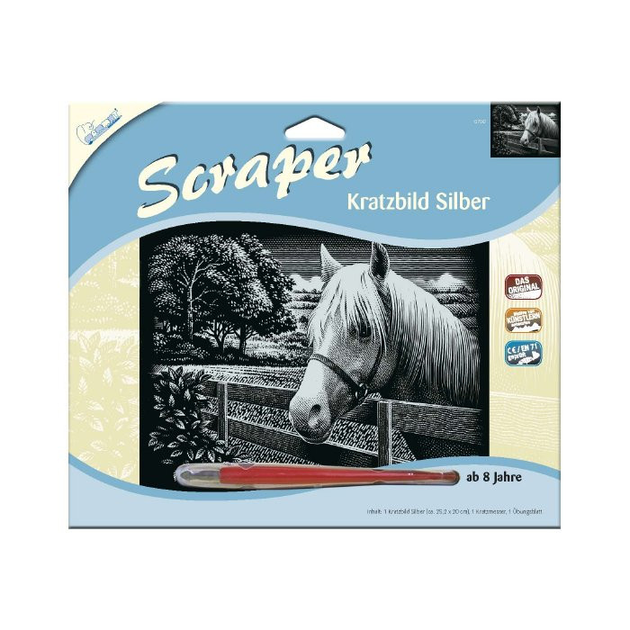 1 ezüst képkarcoló (kb. 25,2 x 20 cm), 1 karcoló kés, 1 gyakorlólap